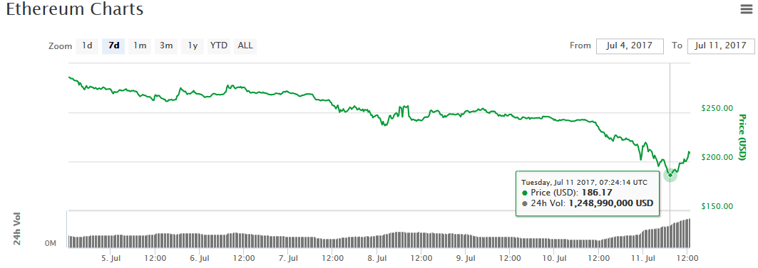 Biến động giá Ethereum từ 4/7 đến 11/7, theo dữ liệu từ CoinMarketCap