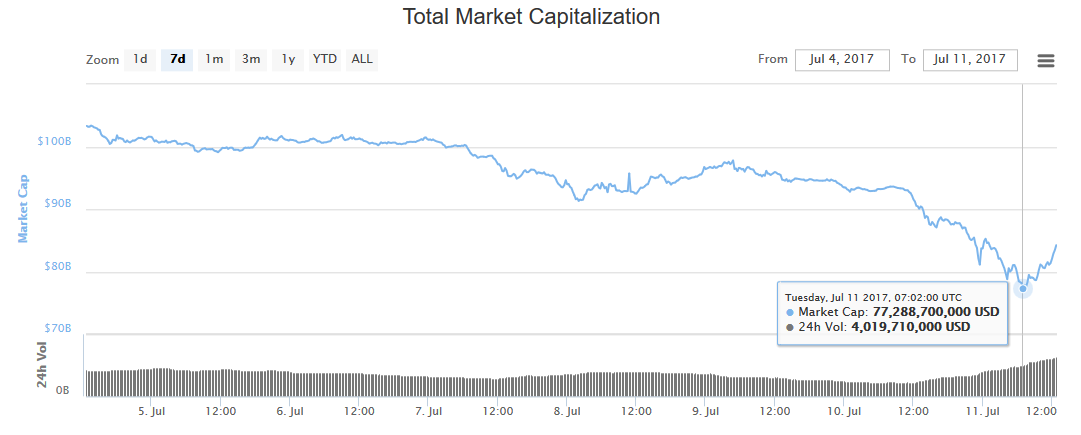 Đợt suy giảm của thị trường tiền điện tử tăng tốc trong ngày hôm qua (11/7), khi mà tổng mức vốn hoá của tất cả các đồng tiền quay về lại mức thấp nhất kể từ tháng 5 đến nay. Tuy đã có một chút phục hồi nhưng nhìn chung trong 24 giờ vừa qua, không đồng tiền thuật toán nào mà lại không gặp thiệt hại.