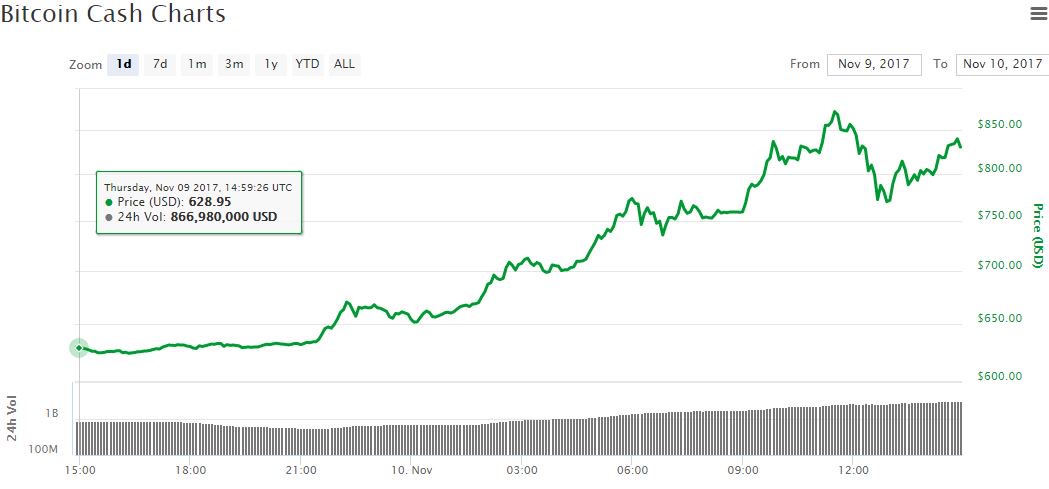 Trong khi giá bitcoin tiếp tục “trượt dốc” thì giá Bitcoin Cash đã bắt đầu tăng một cách đáng kinh ngạc. Chỉ trong vòng 24 giờ qua, giá Bitcoin Cash đã tăng 32%, từ 629 USD lên 826 USD. Việc này giúp đẩy tổng vốn hóa thị trường của Bitcoin Cash lên con số 13,9 tỷ USD, và giá BCH coin hiện giờ chỉ thấp hơn 100 USD so với mức cao nhất mọi thời đại hồi tháng 8.