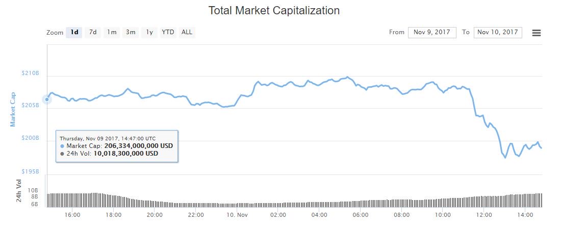 Bất chấp sự tăng vọt của Bitcoin Cash, tổng vốn hóa thị trường của tất cả đồng tiền số đã giảm hơn 7 tỷ USD, cụ thể là giảm từ 206,3 tỷ USD hôm thứ 5 xuống mức 199,2 tỷ USD.