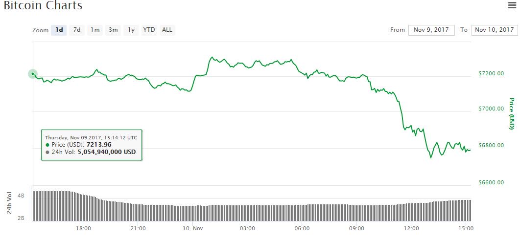 Giá Bitcoin đã giảm đáng kể trong ngày thứ hai liên tiếp, giảm hơn 5% xuống còn 6.795 USD. Hiện tổng vốn hóa thị trường của Bitcoin là 113,3 tỷ USD và chiếm 57% trên tổng số vốn hóa của toàn bộ cryptocurrency.