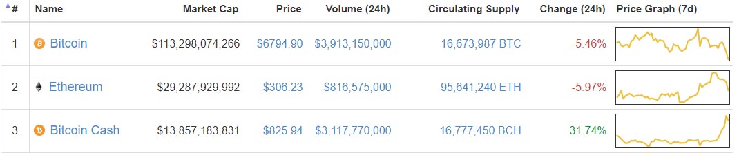 Giá bitcoin giảm xuống dưới 7.000 USD do Bitcoin Cash tăng hơn 30%