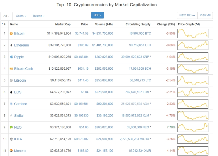 Không chỉ có bitcoin, những đồng tiền còn lại trong top 10 đồng tiền niêm yết trên CoinMarketCap đều chìm trong sắc đỏ. Ngoại lệ chỉ có NEO, tăng 7,7% trong 24 giờ qua.