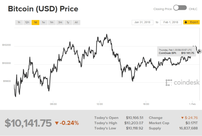 Giá bitcoin hôm nay vào lúc gần 8h sáng (ngày 1/2 theo giờ Việt Nam) ở mức 10.141,75 USD, giảm 0,24% trong 24 giờ qua.