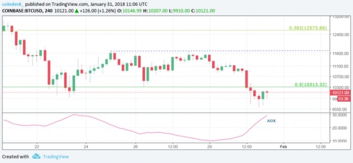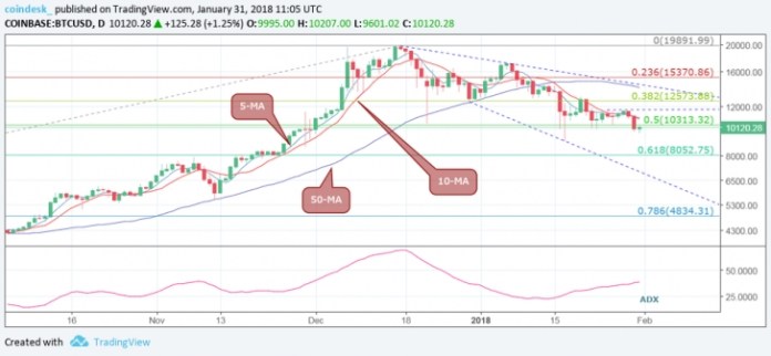 Theo CoinDesk, mức giá đóng cửa của ngày hôm trước (30/1) dưới 10.313 USD (ngưỡng Fibonacci thoái lui 50% từ mức thấp – cao của năm 2017) củng cố thêm xu hướng giảm.
