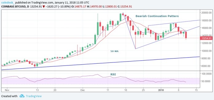 Biểu đồ trên cho thấy (giá theo sàn Coinbase) nến tăng giá có hình ảnh giống một cây búa của hôm qua (nến đỏ có đuôi dài) có nghĩa là một đợt bán tháo từ 17.174 USD (mức cao ngày 6/1) kết thúc tại 13.550 USD (mức thấp ngày hôm trước (10/1). Hơn nữa, giá đóng cửa ngày hôm qua trên đường xu hướng tăng giá (bên trong mô hình nêm tăng).