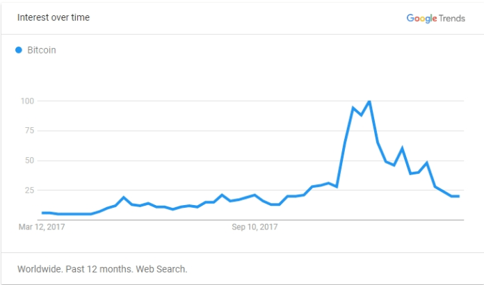 Google Trends cũng cho thấy rằng mức độ phổ biến của từ “bitcoin” cao nhất trong khoảng 17-23 tháng 12, khi bitcoin tăng gần 20.000 USD lần đầu tiên. Tuy nhiên, kể từ đó, những lượt tìm kiếm đối với từ “bitcoin” tụt dốc, và chỉ xếp hạng thứ 19, lần cuối bitcoin ở hạng này là vào tháng 10/2017, khi giá bitcoin vào khoảng 4.300 USD, theo CoinMarketCap.