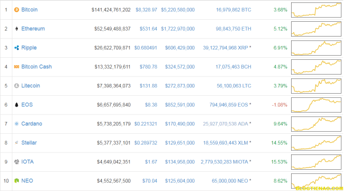 Theo CoinMarketCap, Bitcoin hiện đang giao dịch ở mức 8328.97 USD, tăng 21% trong một tuần, đây là mức giá cao nhất được ghi nhận kể từ hồi giữa tháng 3. Tổng mức vốn hóa thị trường hiện nay đang hướng tới khu vực trị giá 350 tỷ USD trong 2 tháng sắp tới sau khi chúng đã vượt qua được mức 335 tỷ USD.
