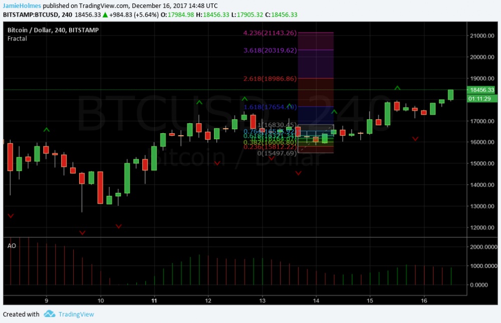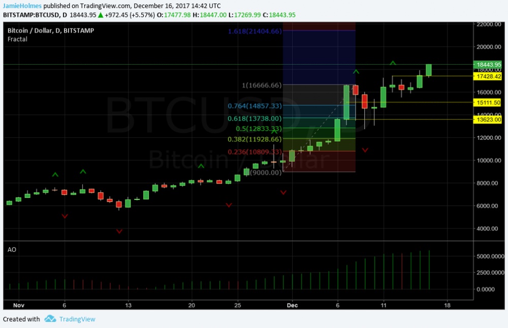 Vào ngày 15/12, thị trường đóng cửa trên mức cao 17.428,42 USD, gợi ý rằng động lực tăng giá này sẽ bắt đầu gia tăng. Hơn nữa, giá ngày 16/12 vượt cao hơn 17.428,42 USD và đạt đến hơn 19.508,64 USD vào lúc 6h22 sáng nay (ngày 17/12 giờ Việt Nam) càng khẳng định hơn nữa xu hướng tăng này.