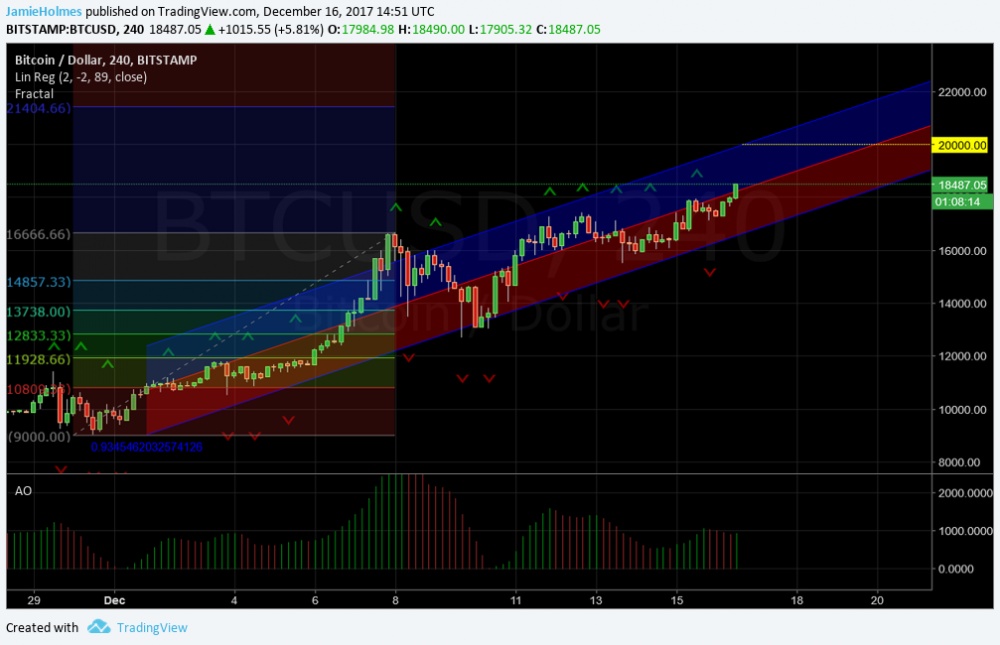 Biểu đồ bên dưới là biểu đồ 4 giờ của bitcoin với chỉ báo hồi quy tuyến tính trong 89 chu kỳ trước. Phân tích kỹ thuật cho thấy giá đang ở giữa kênh dao động và gợi ý rằng thị trường sẽ tiếp tục tăng giá lênmức cao hơn, gần 20.000 USD trong những ngày tới.