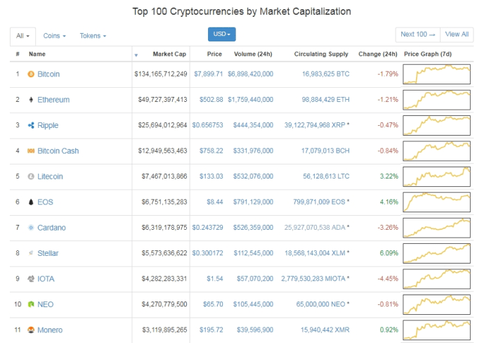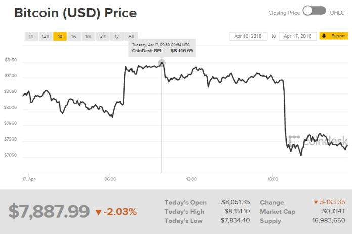 Giá bitcoin hôm nay (18/4) đã rơi xuống dưới ngưỡng 8.000 USD, cho đến 10h sáng nay theo giờ Việt Nam giá bitcoin hiện đang giao dịch tại ngưỡng 7.900 USD giảm 1% so với 24 giờ trước.