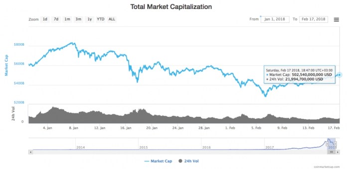 Sau một khởi đầu tương đối chậm chạp trong tháng này, tổng giá trị thị trường tiền kỹ thuật số một lần nữa phá vỡ mốc 500 tỷ USD trong hôm qua (17/2), theo CoinMarketCap. Tổng giá trị thị trường của tiền kỹ thuật số hiện khoảng 502 tỷ USD.