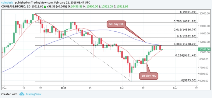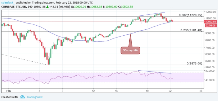 Nói như vậy, một mức giá đóng cửa (theo UTC) dưới đường MA 10 ngày sẽ làm tăng khả năng giảm thấp hơn đến 9.181 USD (ngưỡng Fibonacci thoái lui 23,6%).