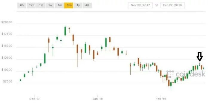 Giá trong 2 ngày qua khẳng định mô hình đảo chiều doji giảm giá. Bitcoin chạm đỉnh cao 3 tuần 11.767 USD vào thứ Ba (21/2), nhưng đóng cửa (theo giờ UTC) chỉ nhỉnh hơn một chút so với ngày trước ở mứcc 11.228,24 USD, tạo nên một mô hình nến “doji mộ bia” (đánh dấu mũi tên). Hơn nữa, BTC giảm hơn 6% trong hôm qua, đánh dấu đợt giảm giá ngay sau nến doji đảo chiều.