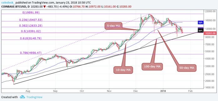 Vừa đóng cửa dưới đường trung bình di động then chốt trong hôm qua (23/1), giá bitcoin (BTC) sẵn sàng mở rộng xuống dưới vùng 10.000 USD.