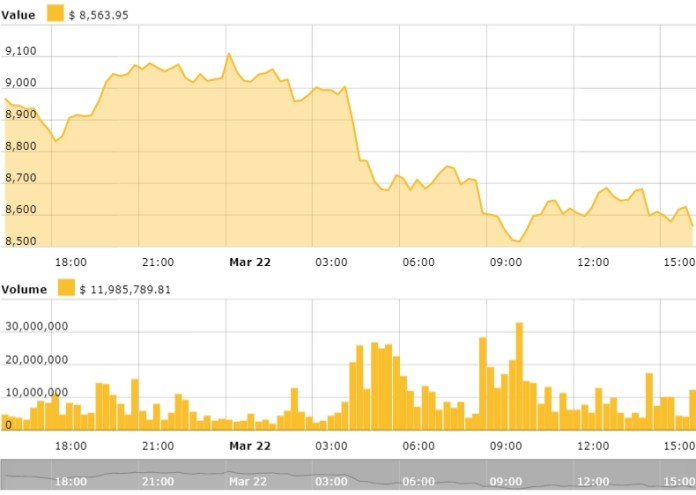 Những tin tức mới nhất từ Nhật Bản dường như khiến cho giá bitcoin rớt 5% hay 4% trong những giờ giao dịch trưa đến tối qua. Giá bitcoin thấp nhất vào lúc 20h45 thứ Sáu ở mức 8.296,33 USD.