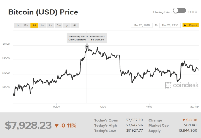 Giá bitcoin hôm nay (29/3) phục hồi nhẹ sau khi thị trường sụt giảm nghiêm trọng trong tuần qua. Đến 17h ngày 28/3, tỷ giá bitcoin ở mức 8.090 USD, sau đó điều chỉnh giảm và ổn định ở mức 7.900 USD, theo chỉ số giá bitcoin của CoinDesk. Vào lúc 7h28 sáng nay, giá bitcoin ghi nhận được là 7.915,68 USD, giảm 0,26% so với giá mở cửa.