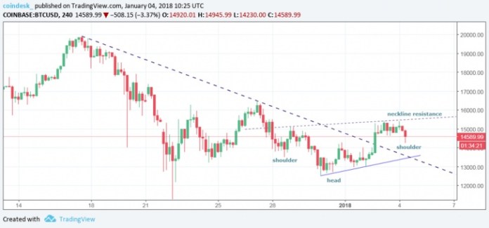 Biểu đồ giá hình thành một mô hình vai đầu vai ngược với “đường cổ” (neckline) ở 15.500 USD.
