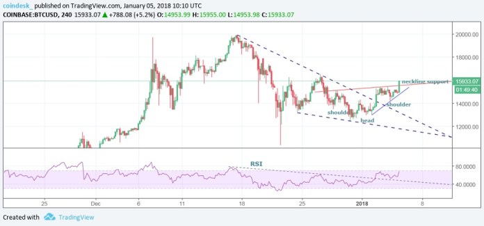 Biểu đồ trên (theo giá của sàn Coinbase) cho thấy một đợt phá vỡ theo mô hình vai đầu vai đảo ngược. Vào lúc 18h đêm qua (giờ Việt Nam ngày 5/1), bitcoin đang giao dịch với khối lượng lớn trên ngưỡng kháng cự “đường cổ” 15.550 USD, do đó đợt phá vỡ này khá chắc chắn. Giá có thể tăng lên đến 18.600 USD (giá mục tiêu theo phương thức đánh giá độ cao đo được) qua cuối tuần.
