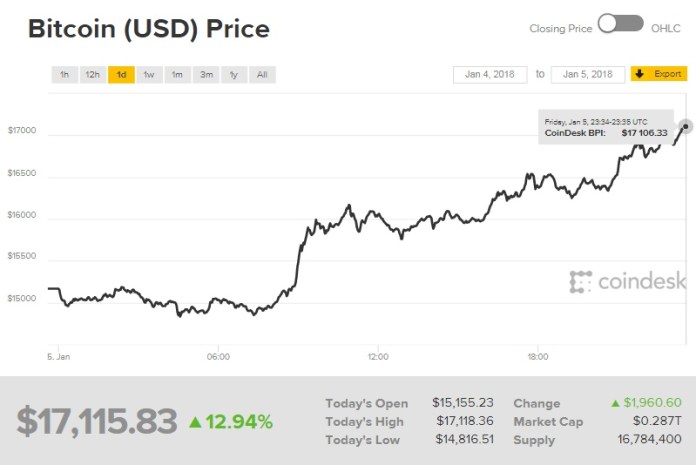 Chỉ số giá bitcoin của CoinDesk tăng 7% lên mức cao trong ngày lên 16.181 USD chỉ trong 2 giờ. Theo CoinMarketCap, đồng tiền kỹ thuật số này vừa tăng 10% trong vòng 24 giờ trước.