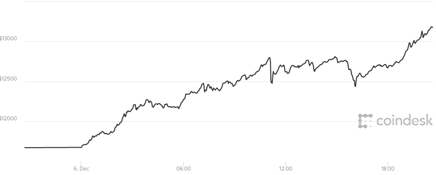 Giá Bitcoin hôm nay 7/12 đang ở mức 13.140 USD, tăng hơn 1.000 USD trong vòng chưa tới 24 giờ, với mức giá mở cửa đang là 11.696 USD đồng tiền này đang tăng 11,96%.