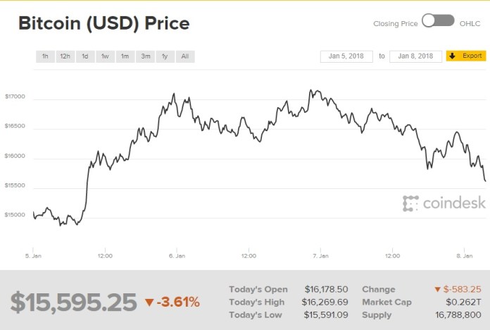 Biểu đồ giá bitcoin từ 5/1 đến 8/1 (Nguồn: CoinDesk)