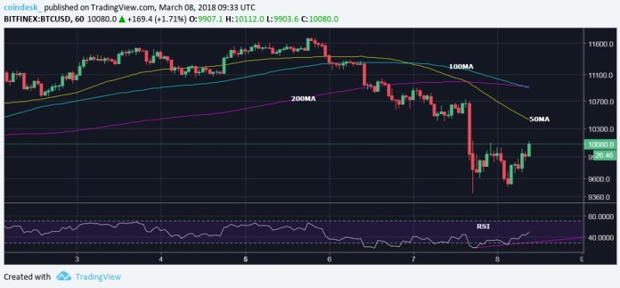 Giá bitcoin gần chạm 9.000 USD vào thứ Năm (8/3), một bước giá xảy ra chỉ vài giờ sau khi đồng tiền kỹ thuật số này trở lại trên 10.000 USD.