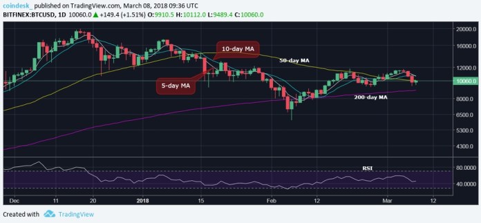 Bitcoin dường như sẽ kiểm tra mức 8.906 USD (đường MA 200 ngày và có thể mở rộng đợt giảm giá xuống 8.000 USD.
