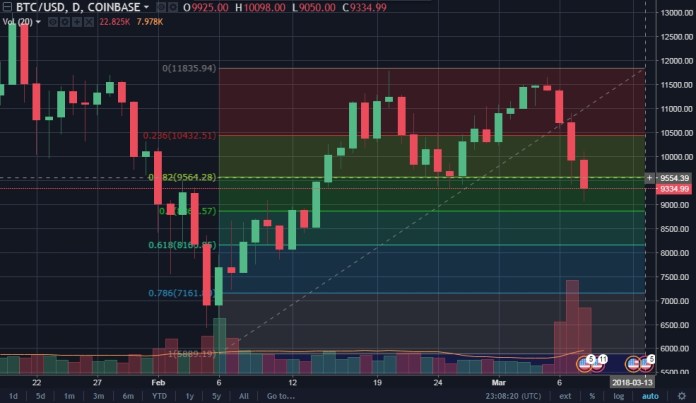 Như trên biểu đồ trên (giá theo sàn Coinbase), BTC giảm mạnh và vừa phá thủng ngưỡng kháng cự mạnh Fibonacci 38,2% ở mức 9.564 USD tính từ đợt tăng giá gần đây trên biểu đồ giá theo ngày.