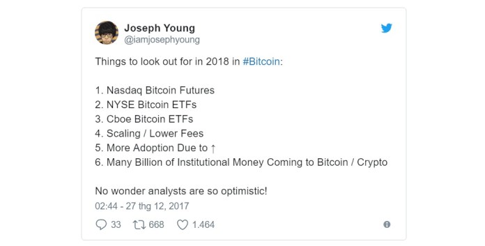 Nhiều nhà phân tích mong đợi năm 2018 sẽ là năm của Bitcoin. Trong khi việc các đồng tiền số khác đang ngày càng phát triển mạnh mẽ, đe dọa sự thống trị của bitcoin, bitcoin khó có thể giữ được giá trị như hiện tại.