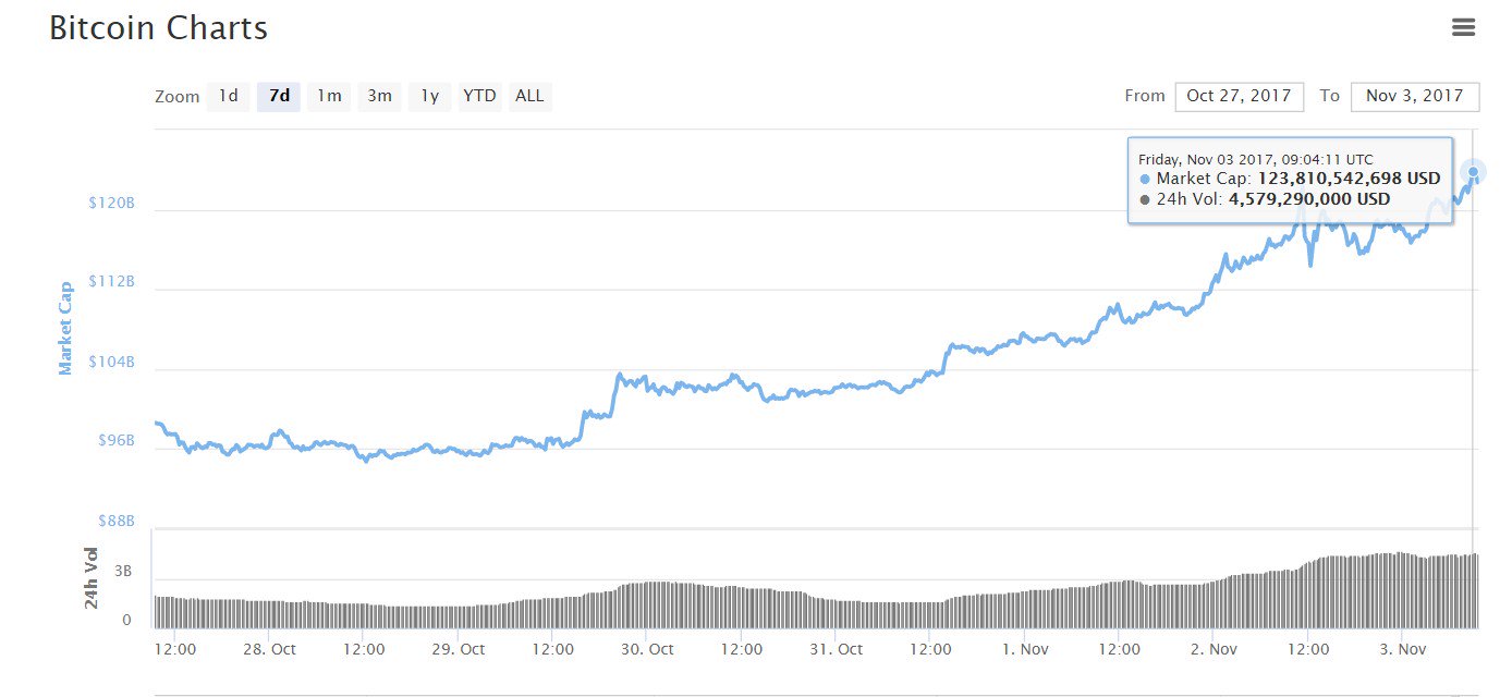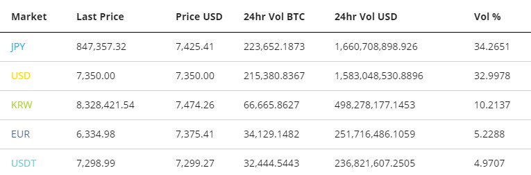 Theo dữ liệu từ BravenewCoin cho thấy giá bitcoin trung bình trên toàn cầu đã đạt mức cao mới là 7,419.28 USD. Thị trường Nhật Bản dẫn đầu về khối lượng giao dịch bitcoin toàn cầu với cặp BTC/JPY, theo sau là các thị trường giao dịch trên đồng USD và KRW của Hàn Quốc, chỉ tính riêng lượng giao dịch của 3 thị trường này đã lên tới hơn 3,5 tỷ USD giá trị bitcoin trong 24h qua.