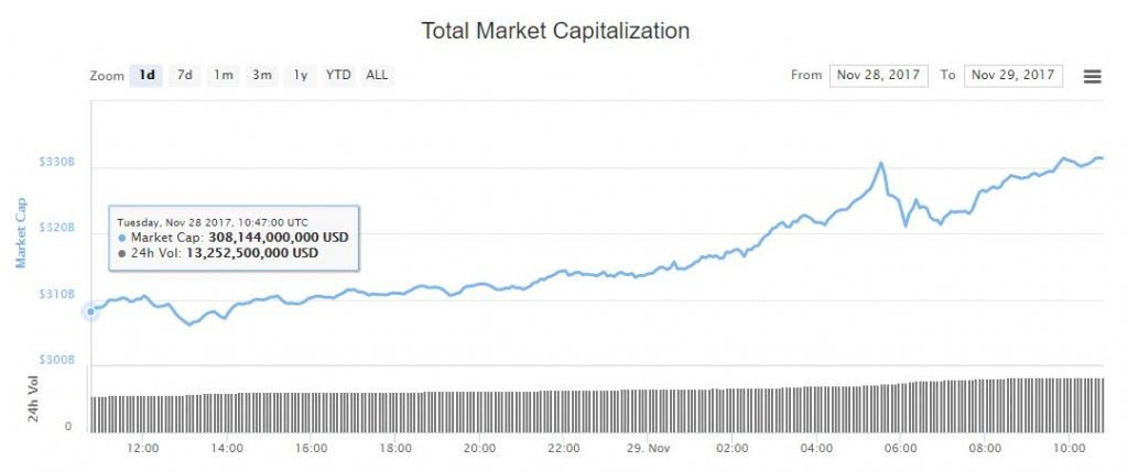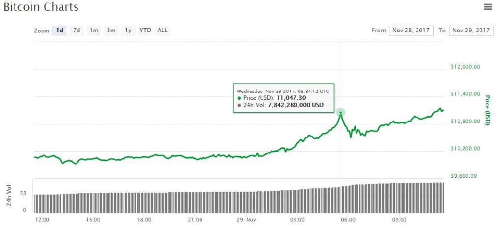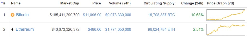 Như thông báo của CCN, giá bitcoin đã hoàn thành cuộc hành trình tới mốc 10.000 USD vào thứ ba, do nhu cầu lớn từ các thương nhân châu Á. Buộc biểu tình giá tiếp tục diễn ra vào thứ tư, và giá bitcoin trung bình trên toàn cầu đã vượt qua mức 11.000 USD khi thương nhân Hàn Quốc đặt giá bán bitcoin lên đến gần 12.000 USD trên các sàn giao dịch trong nước. Vào thời điểm viết bài này, bitcoin đang được giao dịch ở mức 11.096 USD, tương đương với mức tăng 11% trong 24 giờ qua và đẩy mức vốn hóa thị trường lên con số 185.4 tỷ USD.