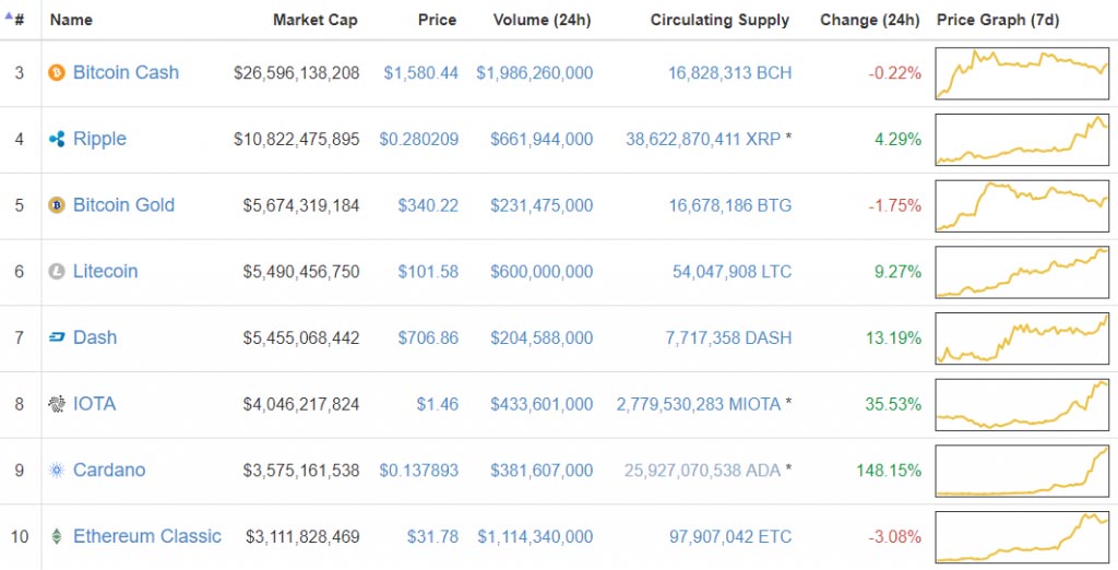 Mặc dù xu hướng tăng là tổng thể, nhưng hai fork lớn nhất của Bitcoin là Bitcoin CashBitcoin Gold đã giảm trong ngày thứ hai liên tiếp. Ripple – đồng altcoin lớn thứ tư thế giới, tăng 4% lên 0.280 USD và có tổng vốn hóa là 10,8 tỷ USD.