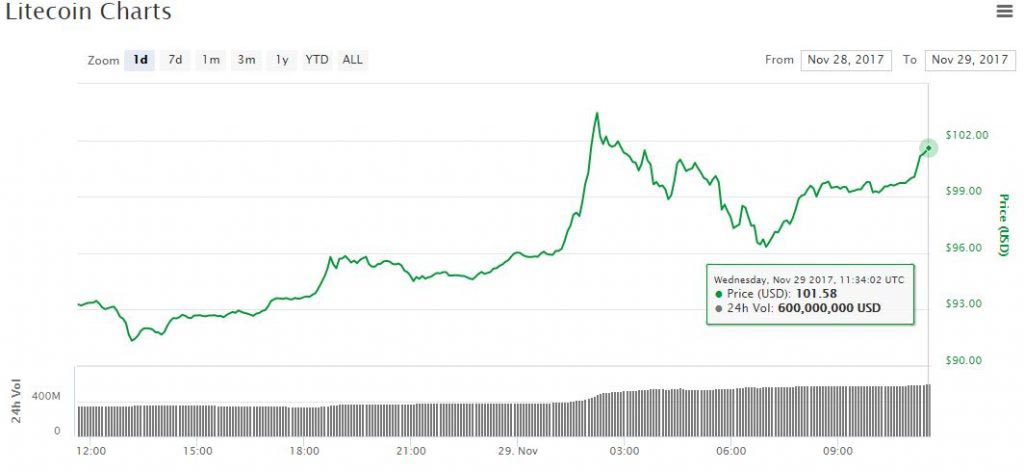 Litecoin – xếp hạng thứ sáu, đã đi theo bitcoin vào vùng giá kỷ lục và cuối cùng đã vượt qua mốc 100 USD lần đầu tiên.
