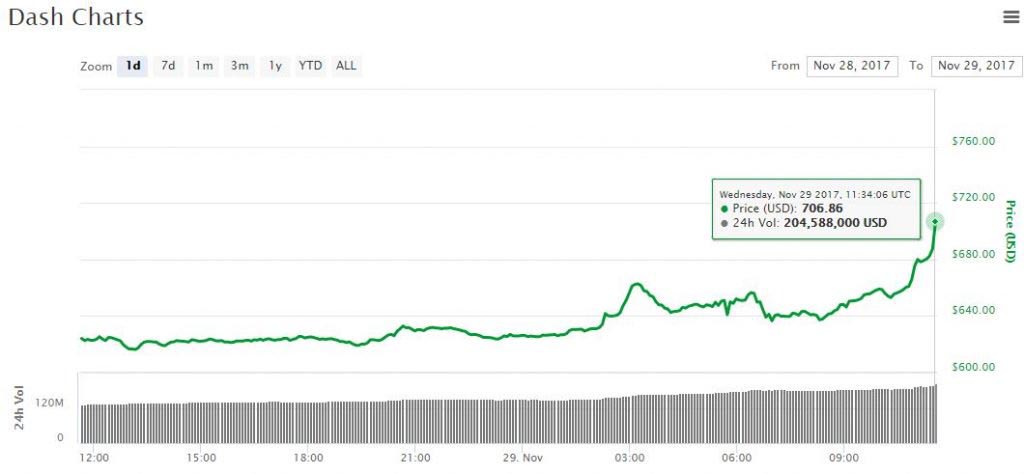 Không muốn là “người thua thiệt”, giá Dash đã tăng 13%, cho phép nó vượt qua mức 700 USD và mức giá cao nhất của Dash ghi nhận là 707 USD.
