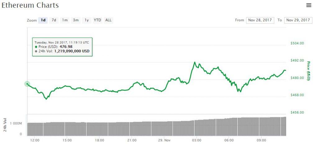 Mặt khác, Ethereum đã cho thấy một giao dịch khá yên tĩnh. Giá Ethereum đã tăng 2,5% trong 24 giờ, đưa giá trị của đồng tiền số lớn thứ 2 thế giới lên 486 USD. Sự tăng giá này giúp Ethereum tiến gần hơn với mức cao nhất mọi thời đại hồi đầu tuần, đồng thời tạo bước đà cho Ethereum vượt qua 500 USD trong tương lai gần.