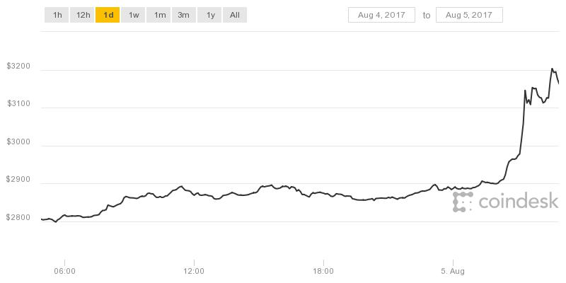 Giá Bitcoin trong buổi sáng ngày hôm nay đã tăng trưởng chóng mặt, lần đầu tiên vượt mức $3,200, theo thống kê về Chỉ số giá Bitcoin (BPI) của CoinDesk.