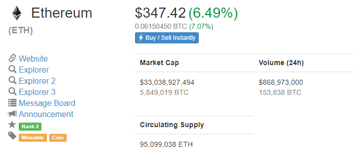 Giá Ethereum đạt 350 USD theo thống kê của Coinmarketcap