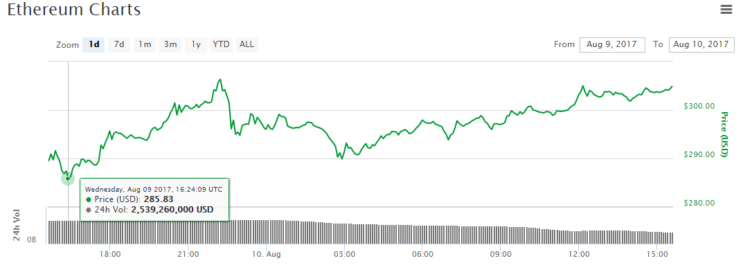 Biến động giá trị của ETH từ ngày 9/8 sang đến 10/8, theo CoinMarketCap