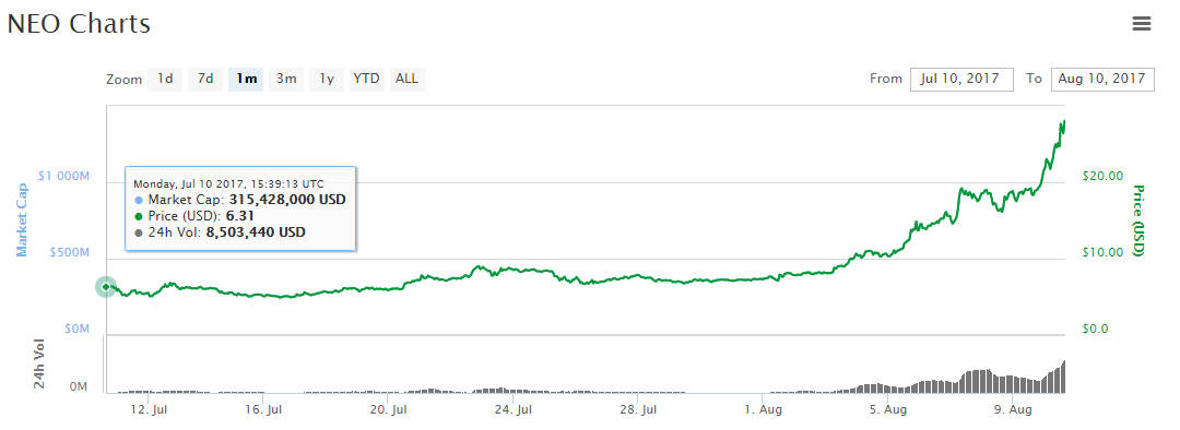 Tăng trưởng giá trị của NEO trong một tháng vừa qua, theo CoinMarketCap