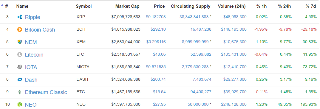 Ngoại trừ Bitcoin Cash ra thì tất cả các altcoin còn lại trong top 10 đều có tăng trưởng trong ngày 10/8. Ripple, Litecoin và Ethereum Classic đều có mức tăng nhẹ, trong khi NEM bất ngờ đi lên đến 10%. Giá IOTA tăng đến 9% sau một tuần thành công trước đó, nhờ vậy giúp đồng tiền này giành lấy vị trí thứ 7 từ tay của Dash.