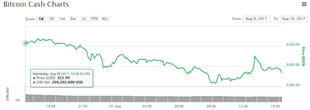 Quá trình đi xuống trở lại của giá giao dịch Bitcoin Cash trong ngày hôm qua (10/8), dữ liệu lấy từ CoinMarketCap