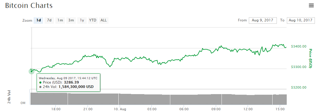 Giá giao dịch Bitcoin đã gặp chút khó khăn cách đây hai ngày khi tụt xuống mức $3,300 trong một quãng thời gian ngắn. Tuy nhiên, cũng giống như bao lần trước đó, BTC lại cố vùng dậy và thành công trong việc trở về ngưỡng $3,400. Ở thời điểm bài viết được thực hiện, Bitcoin đang có giá trị là $3,433/đồng, vốn hoá thị trường xấp xỉ 57 tỉ USD.