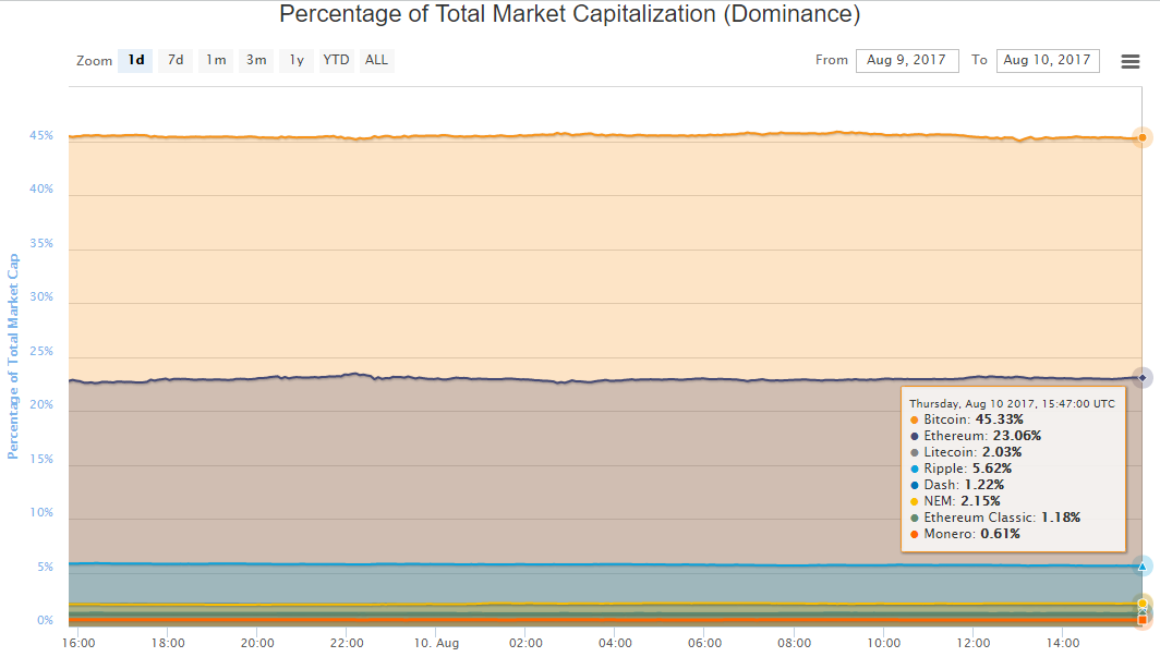 Thị phần thị trường tiền điện tử vẫn duy trì ổn định trong đợt tăng trưởng ngày hôm qua. Bitcoin chỉ giảm nhẹ xuống 45,3%, trong khi thị phần của Etheurem tăng không đáng kể. Ripple, đồng tiền mà đã duy trì ổn định trong hai ngày liến, mất đi 0,2%, thị phần hiện tại chỉ còn là 5,6%.