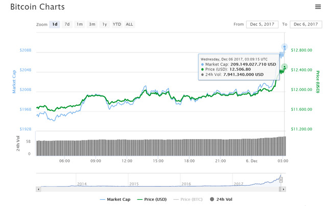 Đà tăng giá chạm mốc 12.506 USD của bitcoin trong ngày 6/12