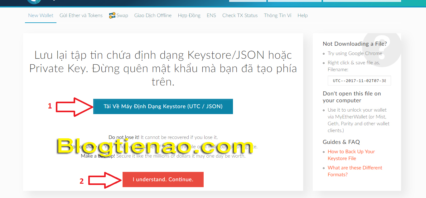 Bước 2: Bạn tải file Keystore về máy tính của bạn bằng cách click vào “Tải về Máy Định Dạng Keystore (UTC/JSON)” sau đó nhấp vào “I understand. Continue.” (File này dùng để đăng nhập vào ví ETH của bạn, tí mình sẽ nói cụ thể)