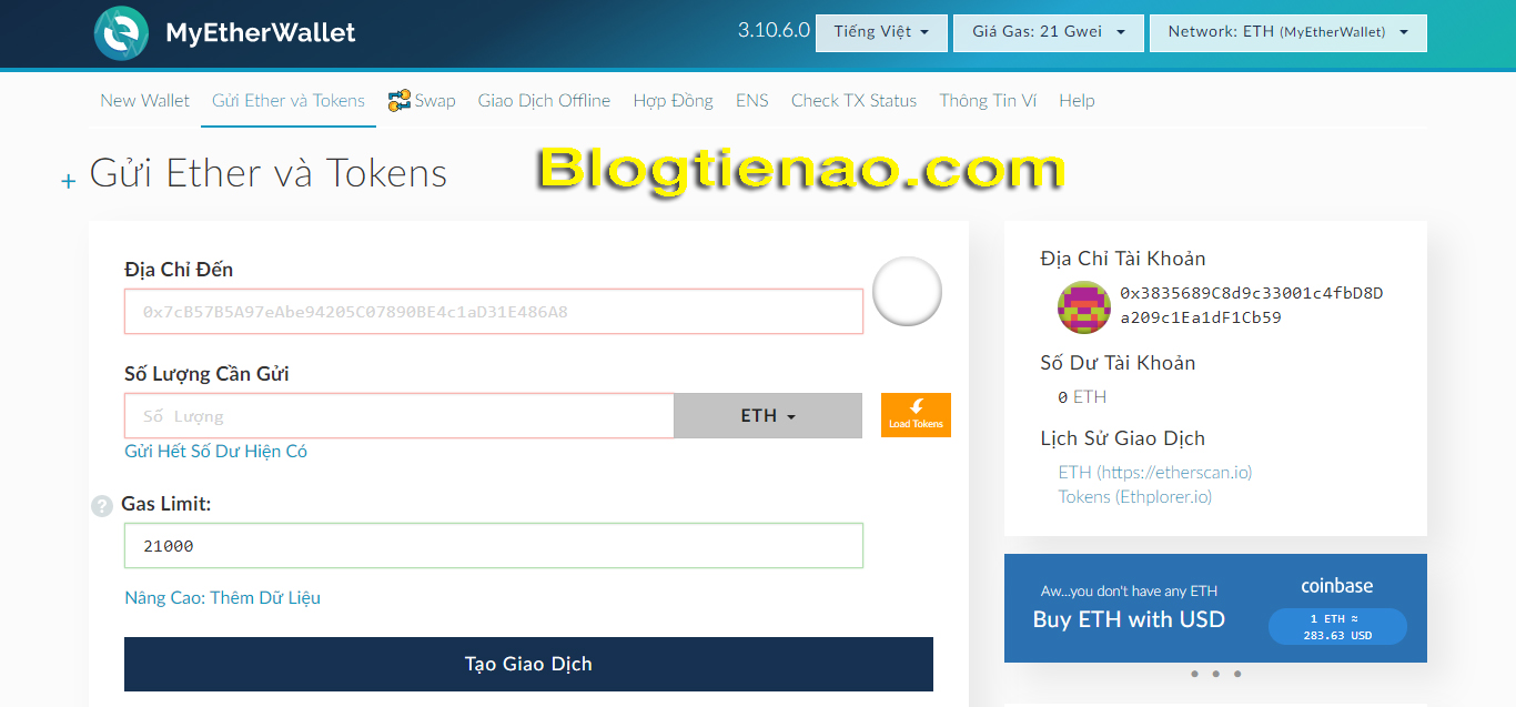 Để gửi Ethereum cho người khác, bạn đăng vào ví và cũng chọn tab “Gửi Ether và Tokens” tại đây bạn nhập vào các thông tin giao dịch gửi: