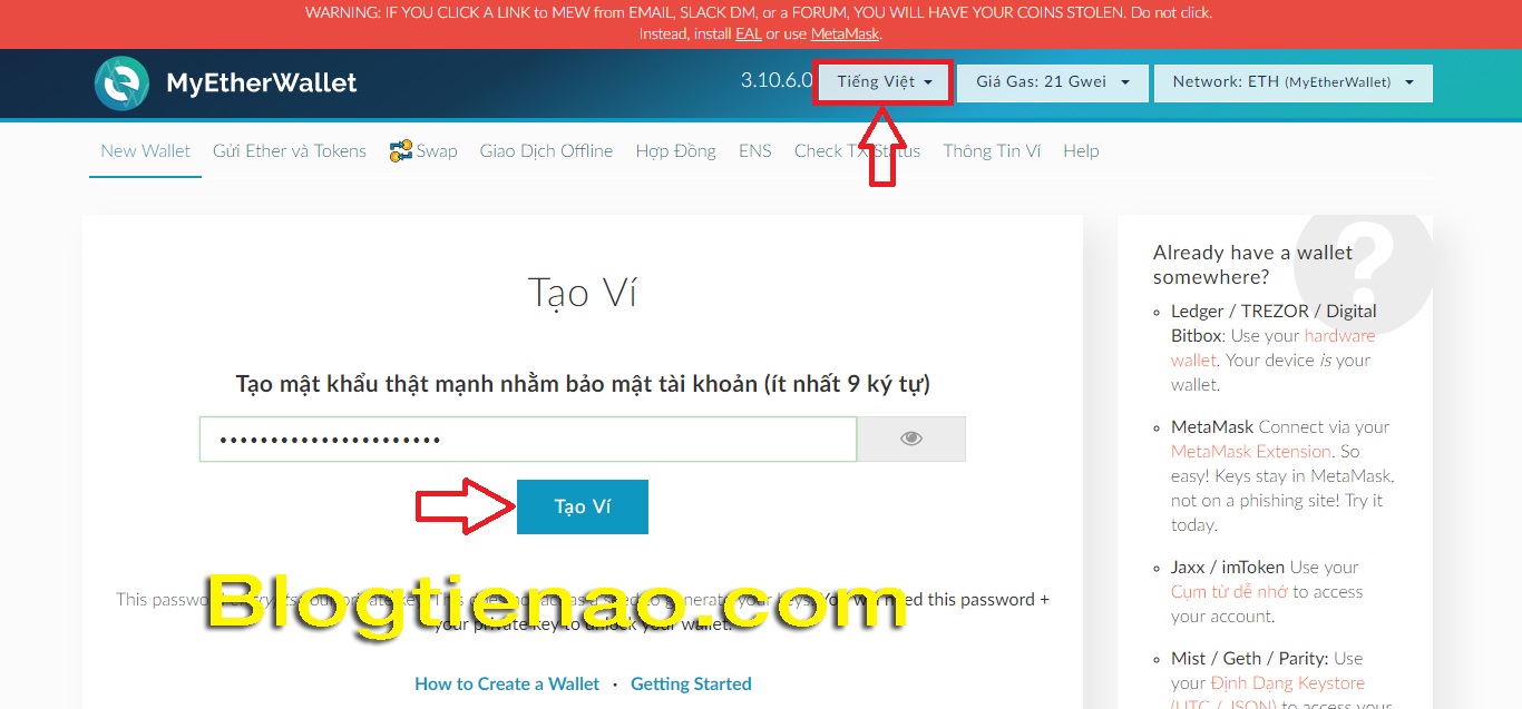 Bước 1: Bạn truy cập vào đây https://www.myetherwallet.com/ (nếu tiếng anh thì bạn chọn tiếng việt ở trên nhứ dưới hình nhé) => nhập vào mật khẩu của bạn và nhấn vào “Tạo Ví”.