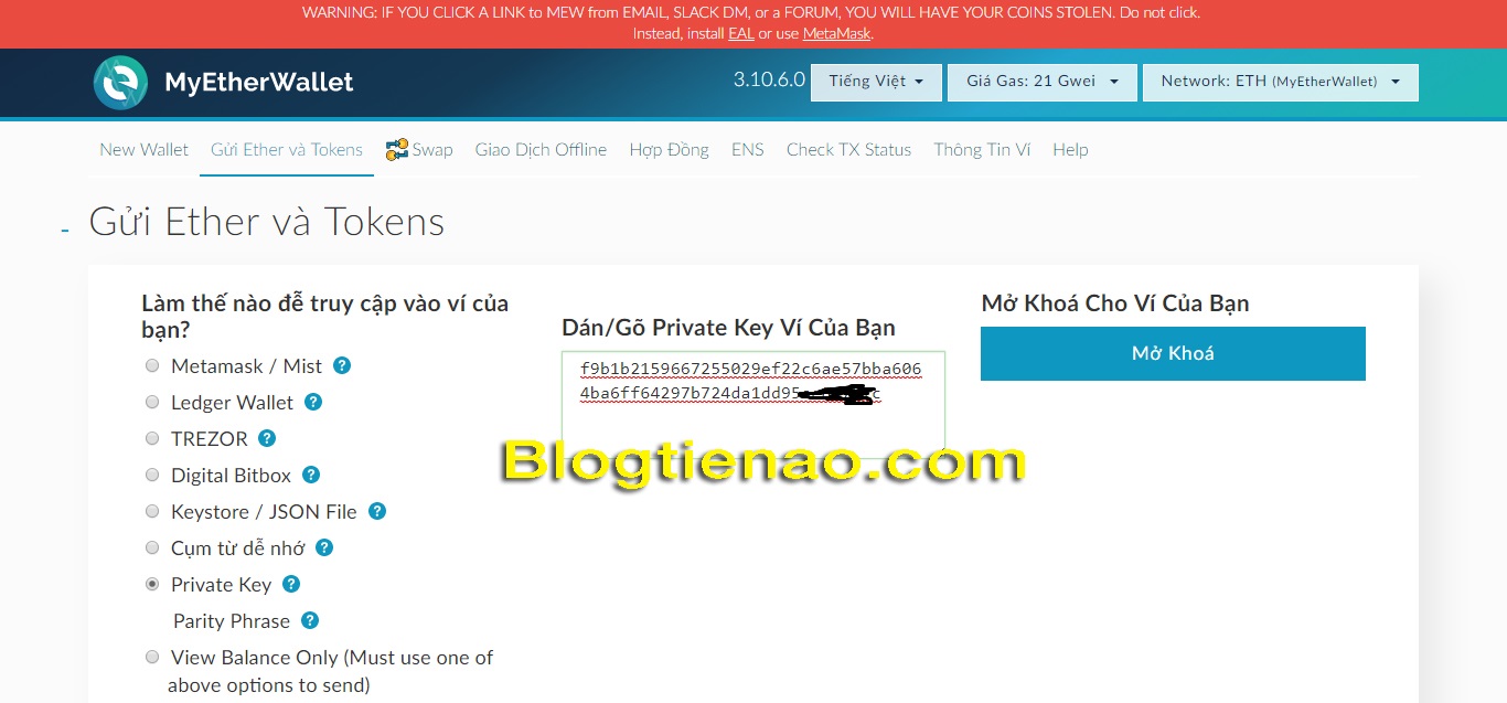 Cách 2: Đăng nhập vào ví MyEtherWallet bằng Private Key, cũng tương tự cách 1 bạn vào “Gửi Ether và Tokens” => chọn “Private Key” => copy và dán “Private Key” mà bạn đã lấy ở bước 3 bào => rồi nhấp “Mở Khóa” là bạn sẽ đăng nhập thành công.