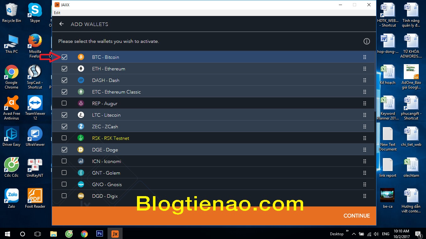 Bước 9: Chọn những đồng coin mà bạn muốn có trong ví Jaxx của mình, ví jaxx hỗ trợ tất cả 32 coin (tí nữa tạo xong bạn có thể thêm hoặc loại bỏ sau cũng được).